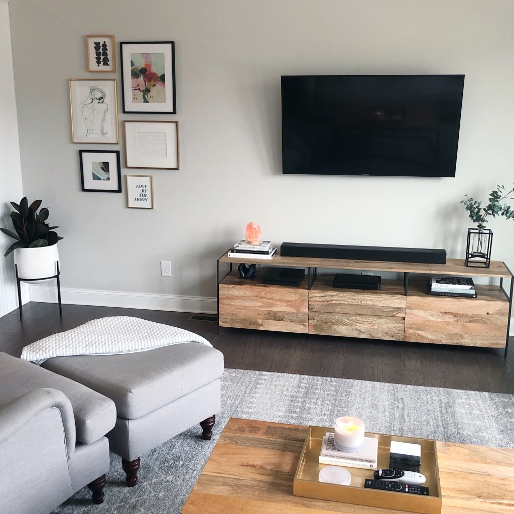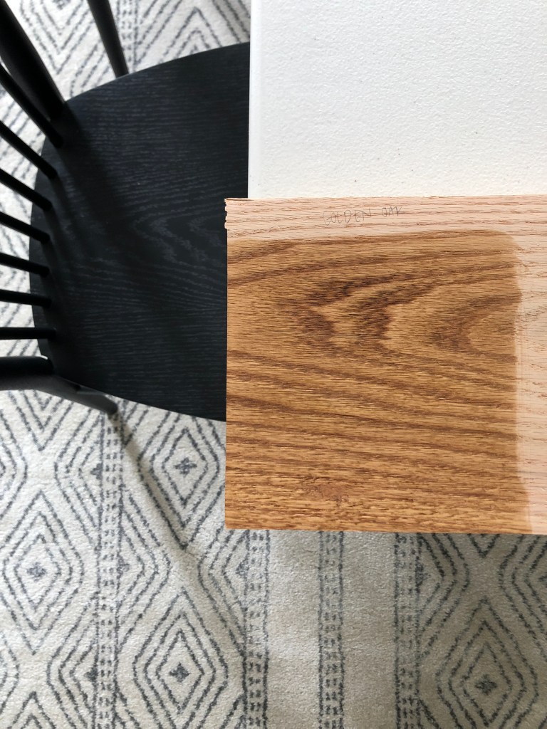 So while the men got started on the project, I started selecting the stain! I have a few pieces in my den from West Elm that I knew I wanted to match. Since our home is just a full open floorpan, I needed everything to be cohesive and a similar tone of wood! Here are the WE pieces we have, and the stain I ultimately chose: