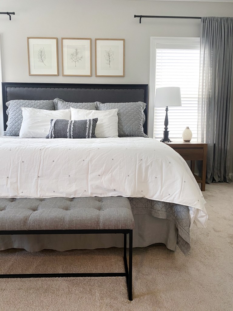 Now since moving to the new house, we got a new bedroom set of furniture and updated our decor/bedding to be more modern and clean, I fully redid this same headboard! I took this one down, painted the trim black, and got new fabric and taping. Thankfully I had all those extra tacks left over and saved from the first time around, so I was able to use those instead of wasting them!