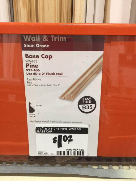 –Pine Base Cap (image from home depot attached) 1 piece cut to 7ft (mitered, longest point at 7 feet) / 2 pieces cut to 4ft (mitered at top, longest point at 4 feet)