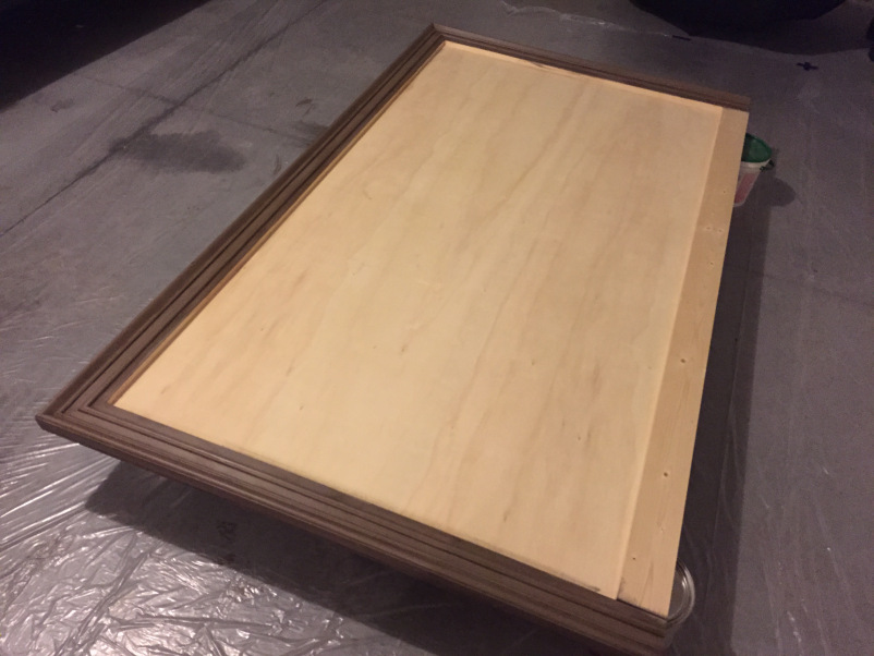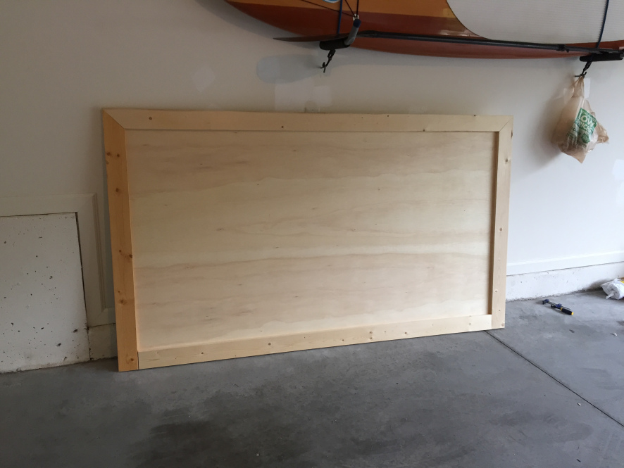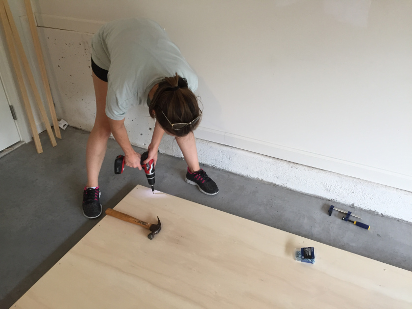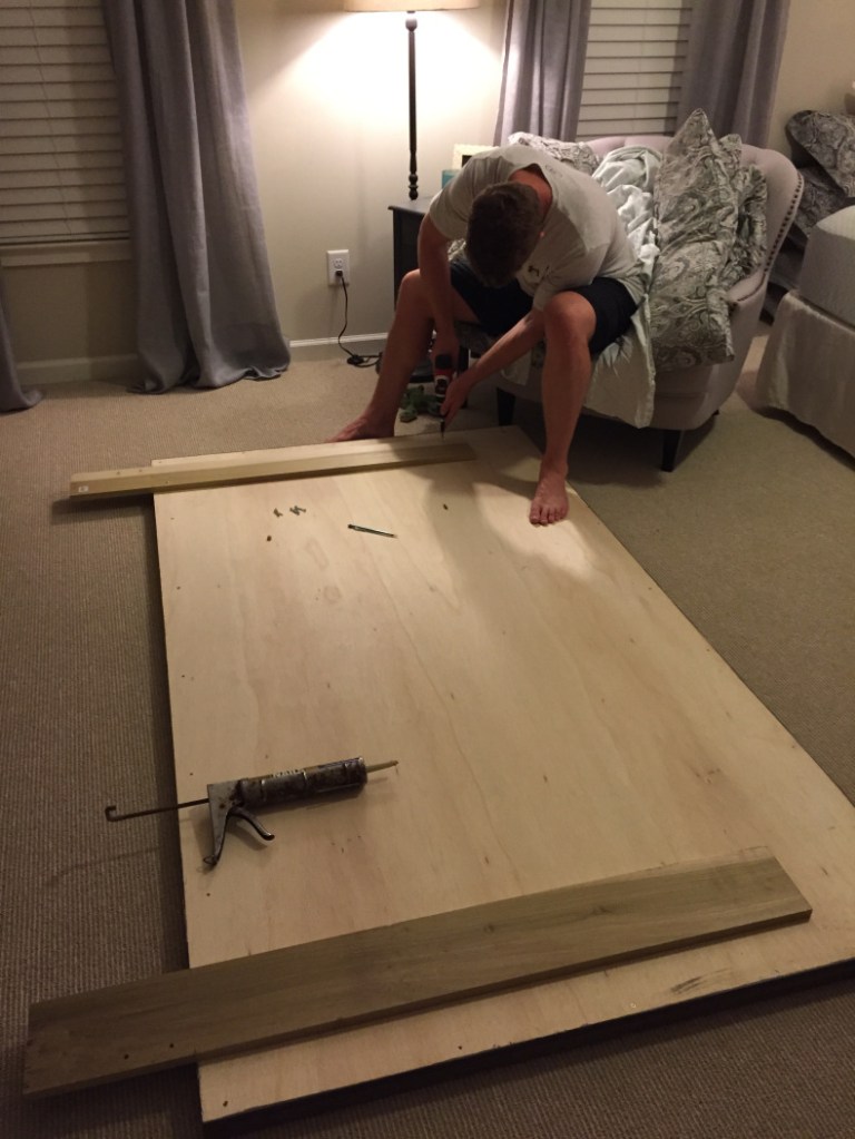 After you get all your pieces cut, you’ll attach the 1x4s to the plywood sheet, I got crafty and figured out that I need to attach those pieces from the back so that you couldn’t see the screws.. logical. You can use the wood glue to get everything into place and let it set for a bit before you screw it all together, that way you can just lay the plywood sheet face down and everything should stay in place