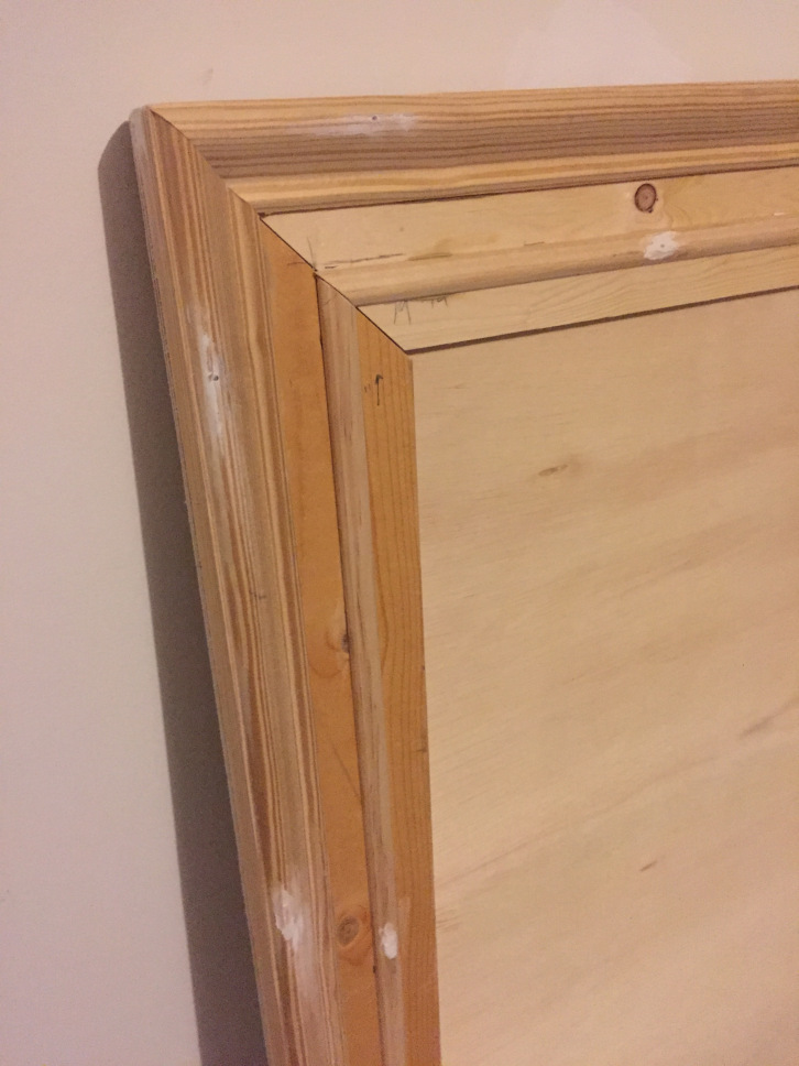 Once you have your 1x4s attached like the image below, you’ll use the wood glue to place your panel molding and smaller trim molding.