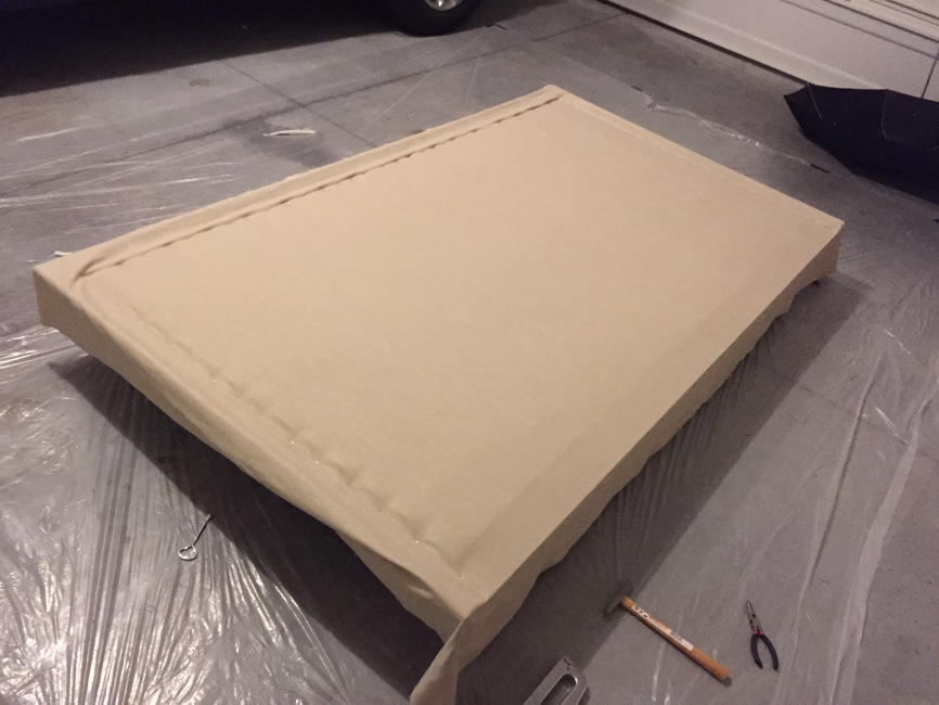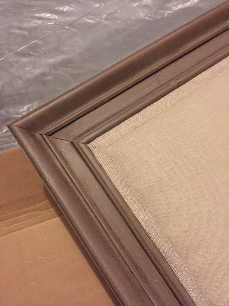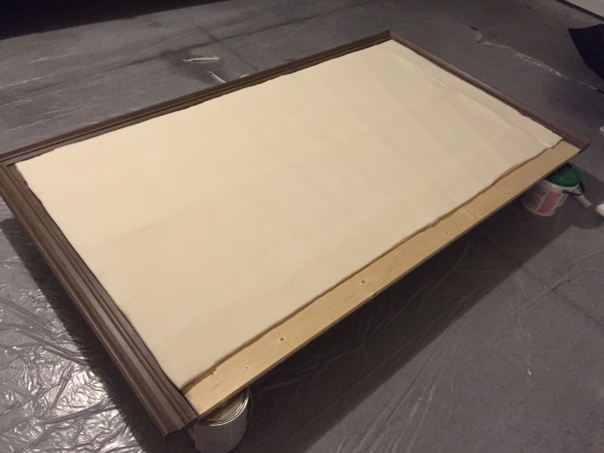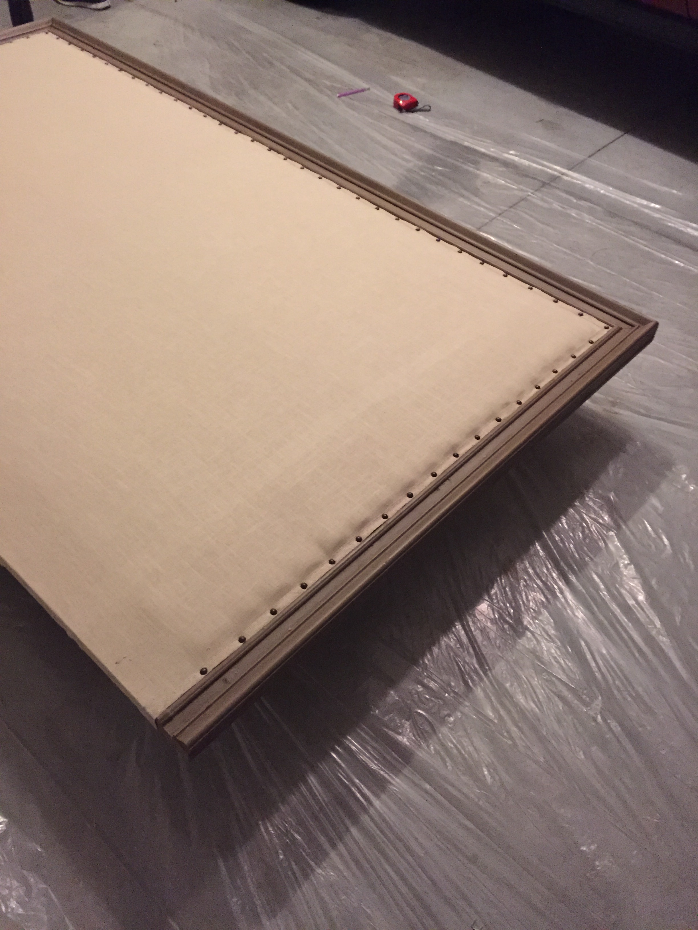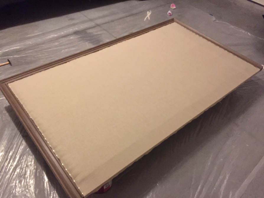 Next comes the upholstery! I found the linen I wanted to use on sale at Hobby Lobby, take whatever fabric you like and you’ll stretch it across and staple it along the edge of the smaller trim molding. (refer to the tutorial mentioned earlier, she gives better detailed pics of the best way to do this!)