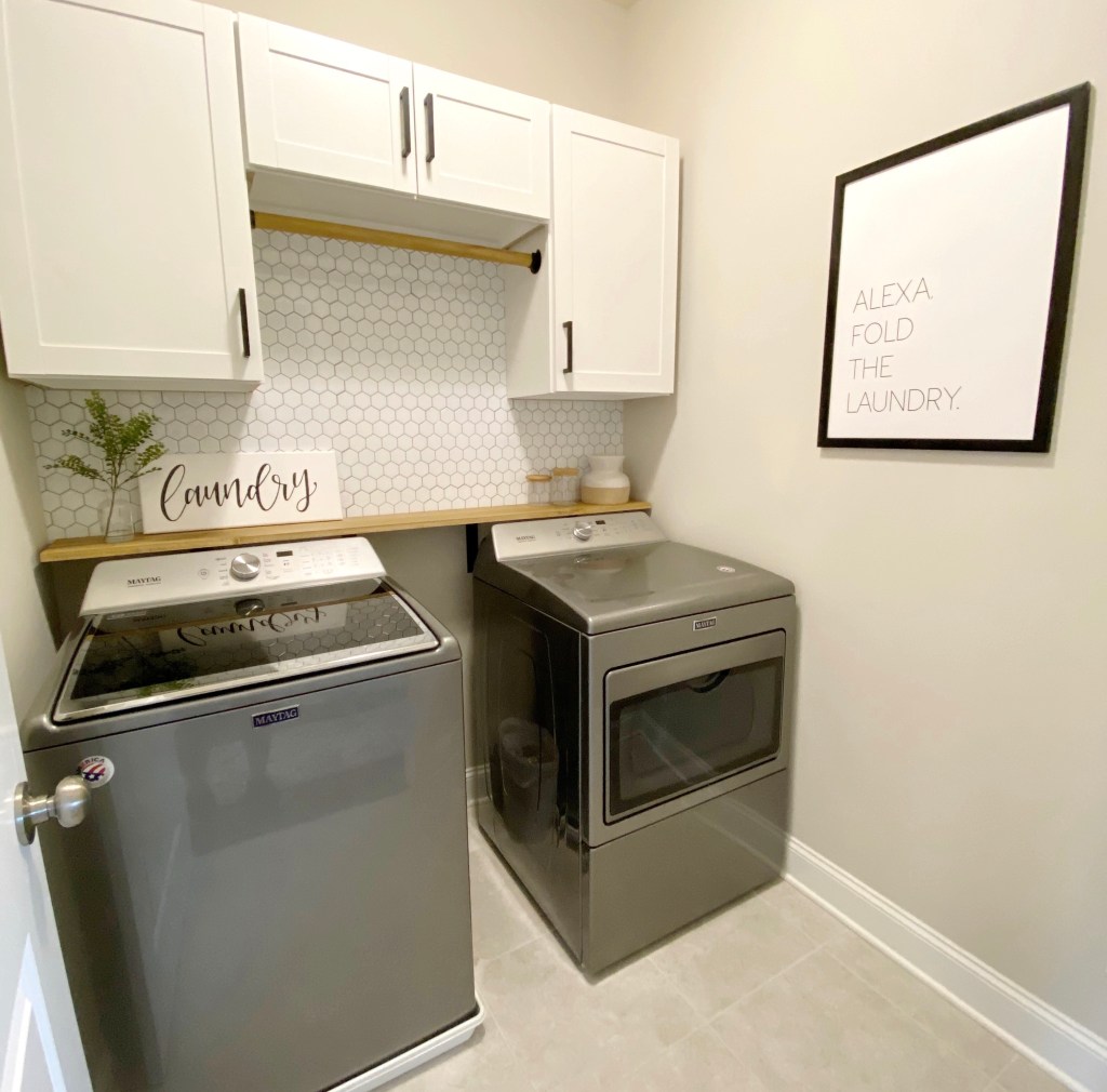 I added in a few pieces of decor, and then started working the ‘artwork’ I knew I wanted to add! One of my favorite bloggers, The Blooming Nest, has a large piece in her laundry that says “Alexa, fold the laundry.” and I just knew I needed one too!