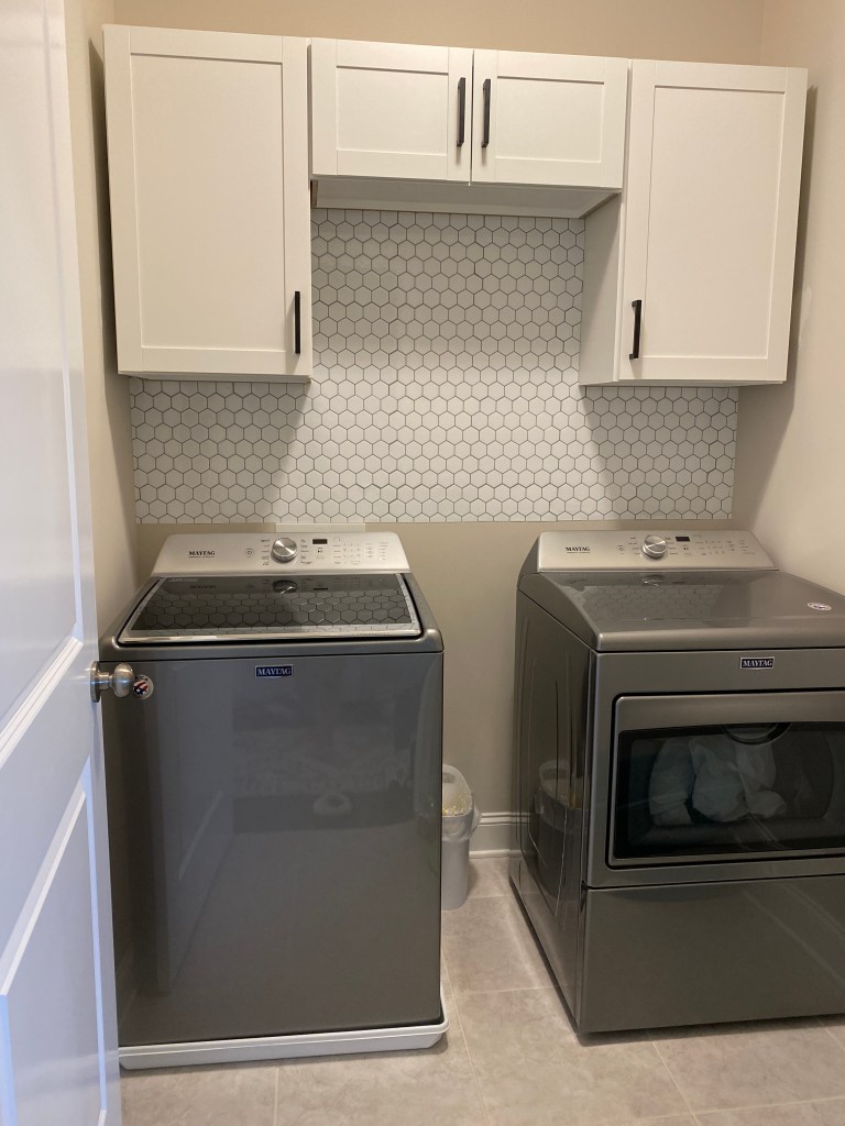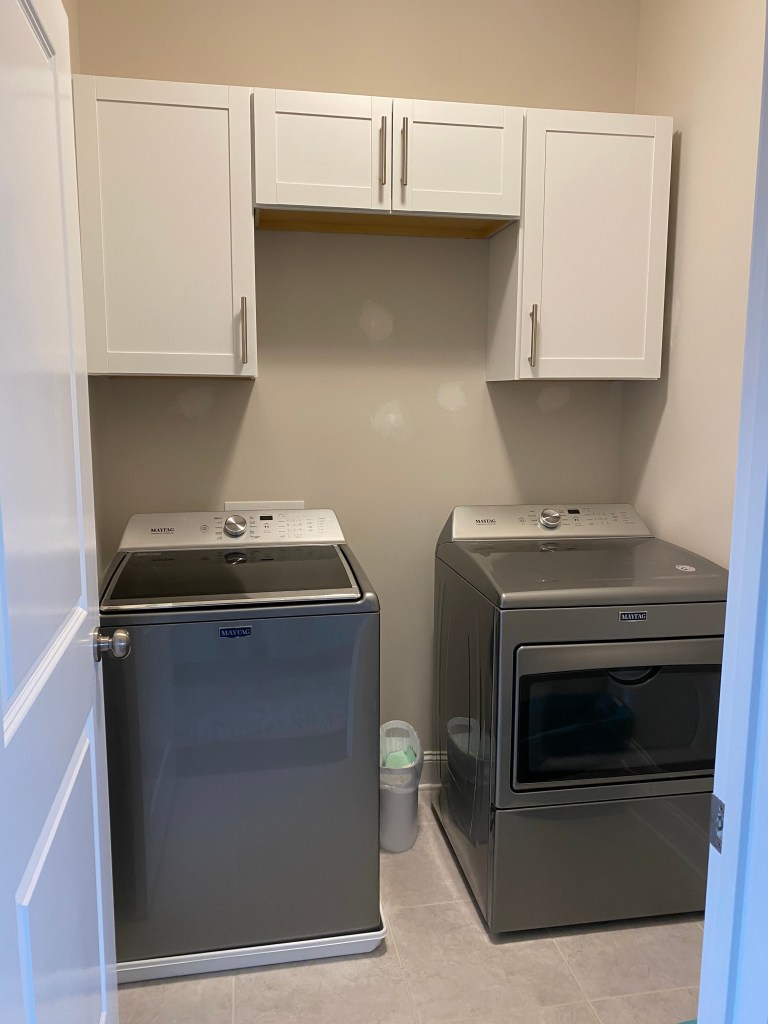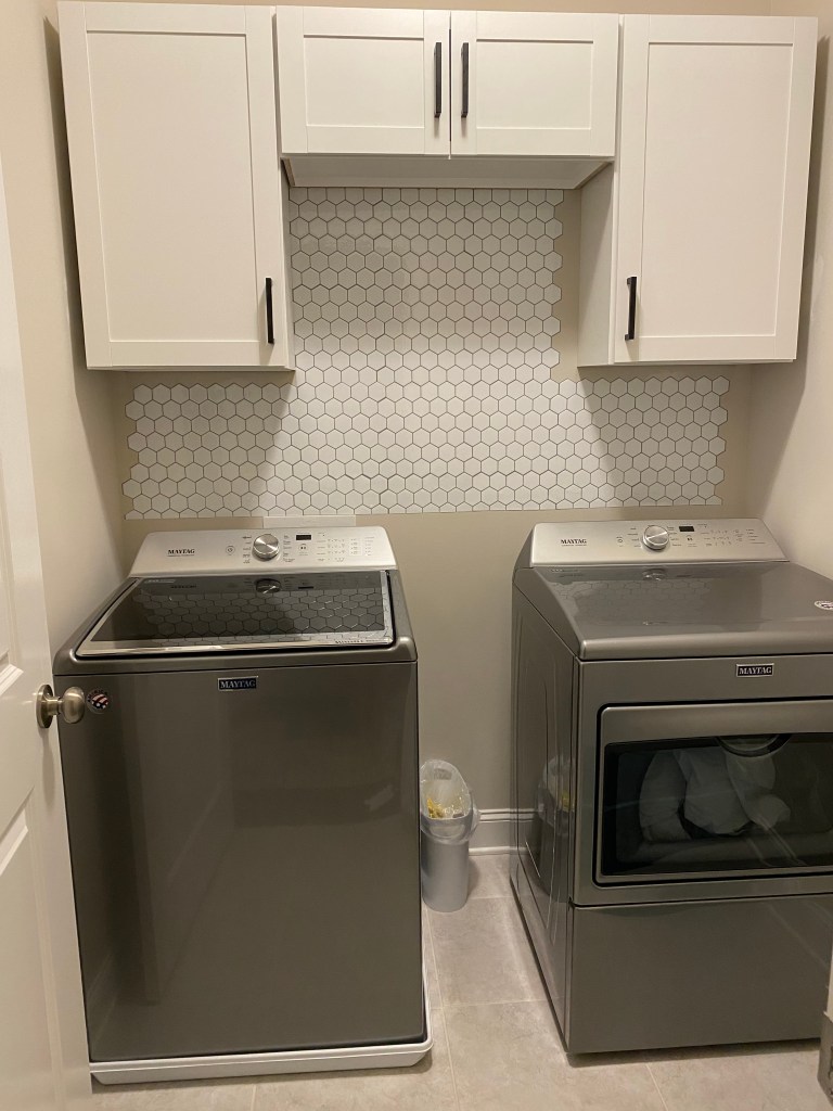 We opted to get the in-stock cabinets from Lowe’s, because it’s a laundry room we didn’t really feel like it needed to be super fancy. But luckily they have some in stock that match (pretty close..) to our kitchen and master bath cabinets!
