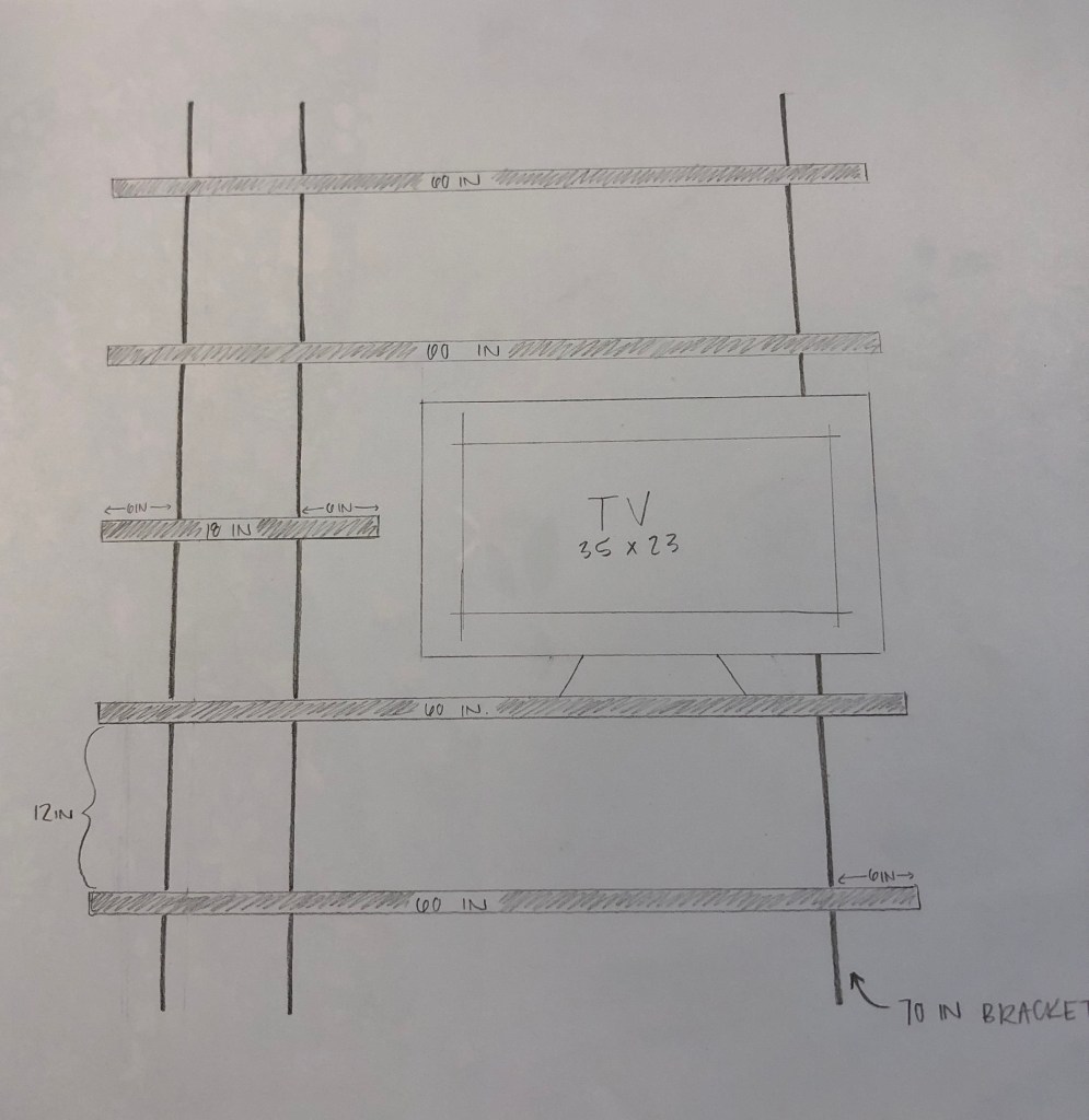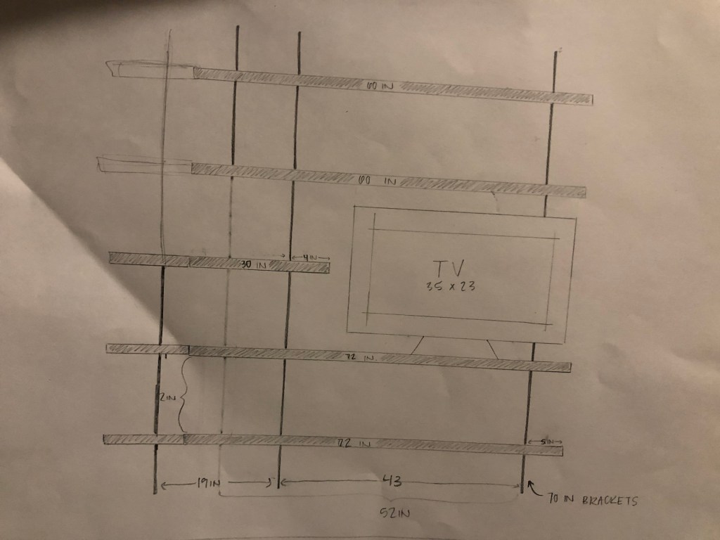 Here was my initial sketch layout of what I had envisioned in my head, to accommodate the TV and all