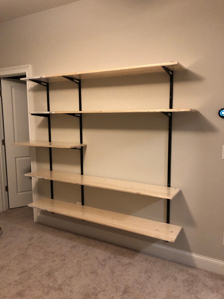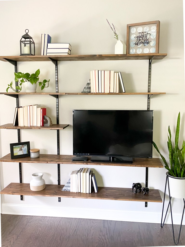 My husband’s office is on the basement level of our townhome, and as we started to get more settled in the house, we knew we wanted to do a cool shelving unit on a side wall to showcase all the books he has read and novelties he wanted to show off. (Like a frame that holds all our football game tickets to championship games, employee awards, pictures of me.. you get the idea)