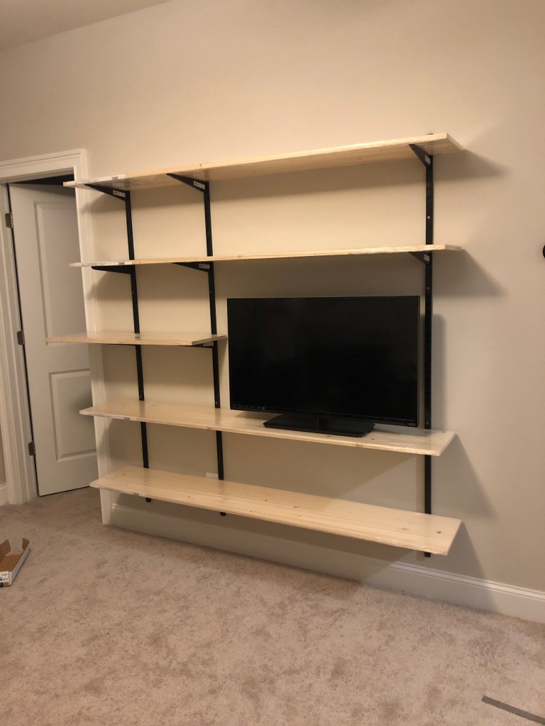 We mounted the 3 track uprights to the studs in the wall after measuring out and making sure everything would still fit/work like we wanted to, and thankfully it did! You can see here we had just placed the wood pieces on before cutting/staining to make sure they would work!
