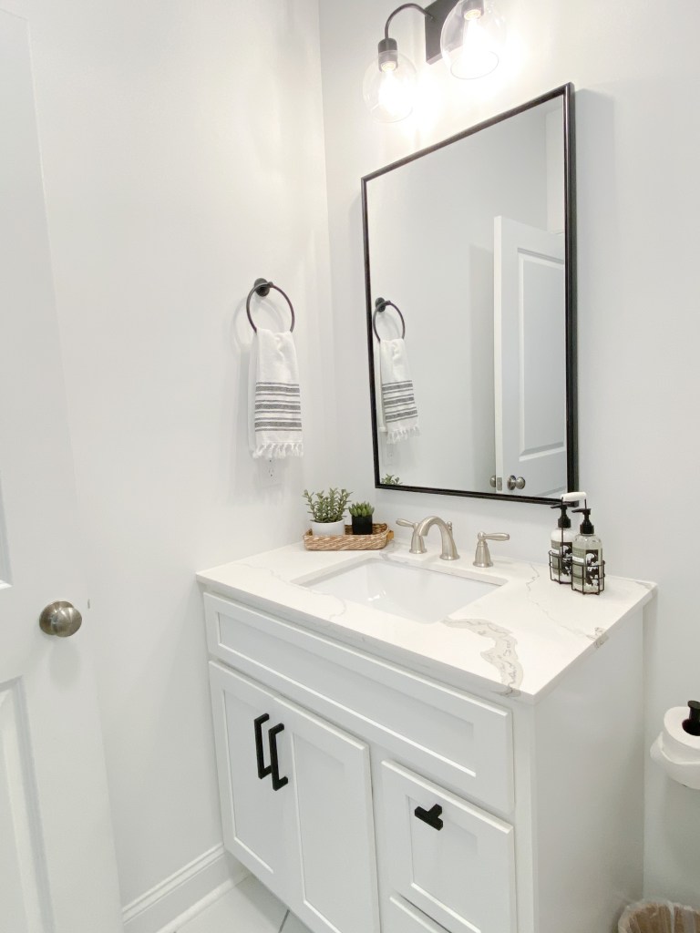 During this project we also installed a new vanity in the upstairs powder room, and were able to utilize the faucet from that bathroom down here. Which was a huge win because when building, the builders did upgrade our faucets, so all our fixtures are really nice Moen faucets! I didn’t want to trash this guy (or buy a new one when we had one that would have costed us another $150!) so that was a great repurpose. I also love how it coordinates with the veining on the counter!