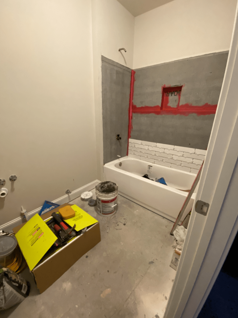 If you look closely at the previous photo, you can see that the bottom two rows of tile, and a few others scattered above seem to be slightly more grey than the other tiles.. even though we made sure to get tiles that were all from the same lot, apparently there were a few that had some discoloration. I, of course, started to panic when I noticed it, but by the time we realized it was pretty much already too late. They would have to rip out all the rile already installed and reinstall new concrete board, so would have added cost and delayed the workers. Thankfully, it’s really not as bad in person as it is in photos. So I conceded and we kept going. You can see here with the full shower finished the difference, and that the rest of the shower is bright white: