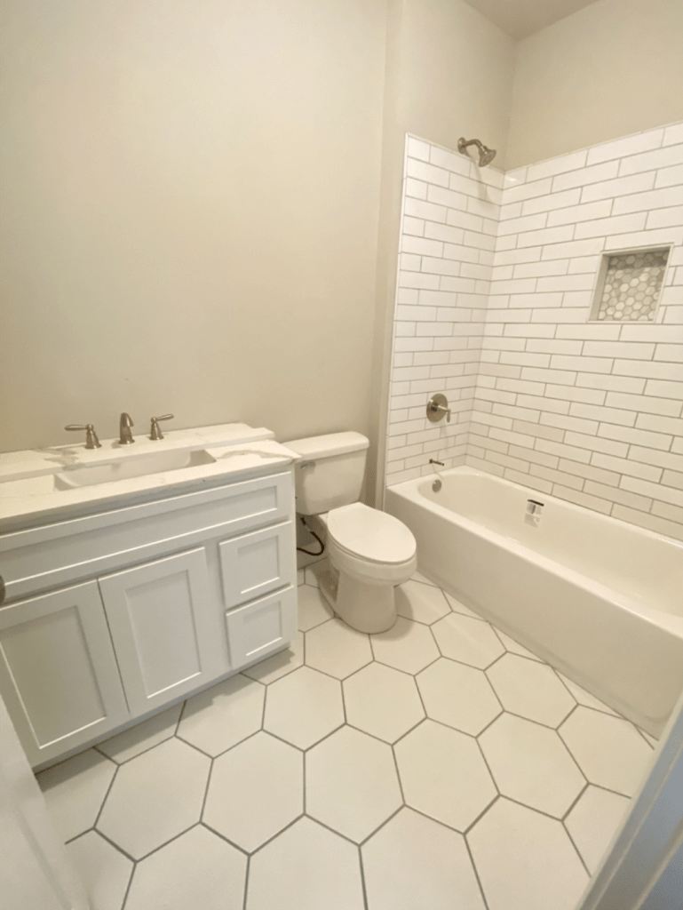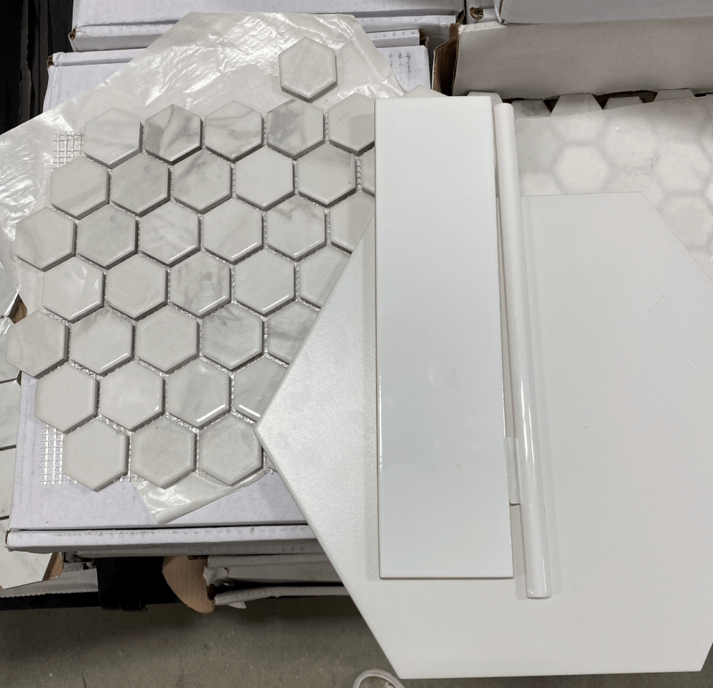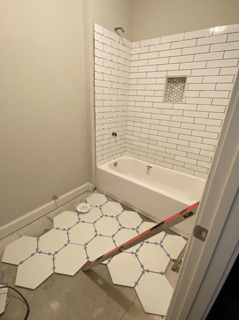 After we secured the counter, then we felt good to pick complementary tile. We went to Floor & Decor and found a lot of great options, but I knew I wanted something a little non-traditional so we went with hex shaped tiles for the floor. (I wanted black.. but Chris disagreed so we settled on white for resale value sake). We did longer subway tiles for the shower, and as an added detail we found a marble hex shaped accent piece for an insert in the shower to tie the floor and the countertop all together!